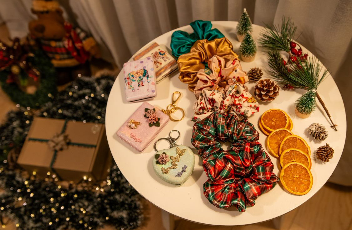 - 4. Коледно скрънчи за коса, изработено от сатен.